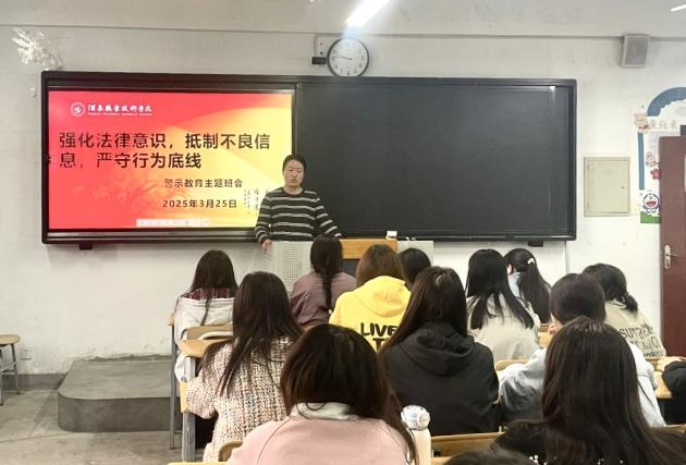 为贯彻落实新时代网络文明建设要求,提升学生网络素养、网络安全意识和自我防护技能,3月25日,教育与艺术学院组织学院各班级开展"强化法律意识·抵制不良信息·严守行为底线”警示教育主题班会。