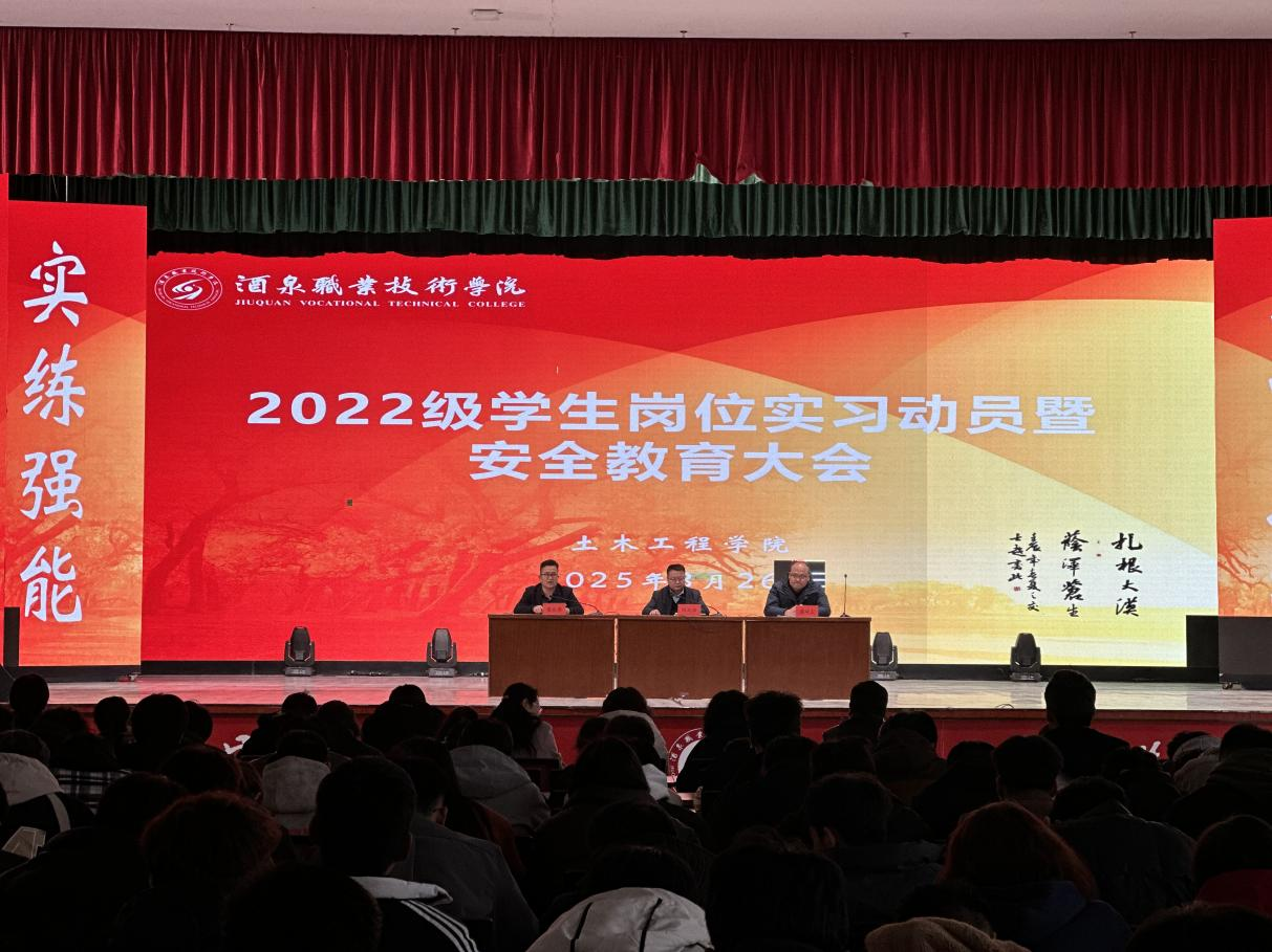 为深入贯彻落实教育部等八部门印发的《职业学校学生实习管理规定》和《甘肃省职业学校学生实习管理办法(试行)》等文件精神,切实做好2022级学生岗位实习工作,提高学生对实习重要性的认识,强化实习期间的安全防范意识。3月26日,土木工程学院在胡杨文化活动中心举行2022级学生岗位实习动员暨安全教育大会。会议由副院长蔺栓保主持,全体2022级实习学生、毕业班班主任及实习指导老师参加了会议。