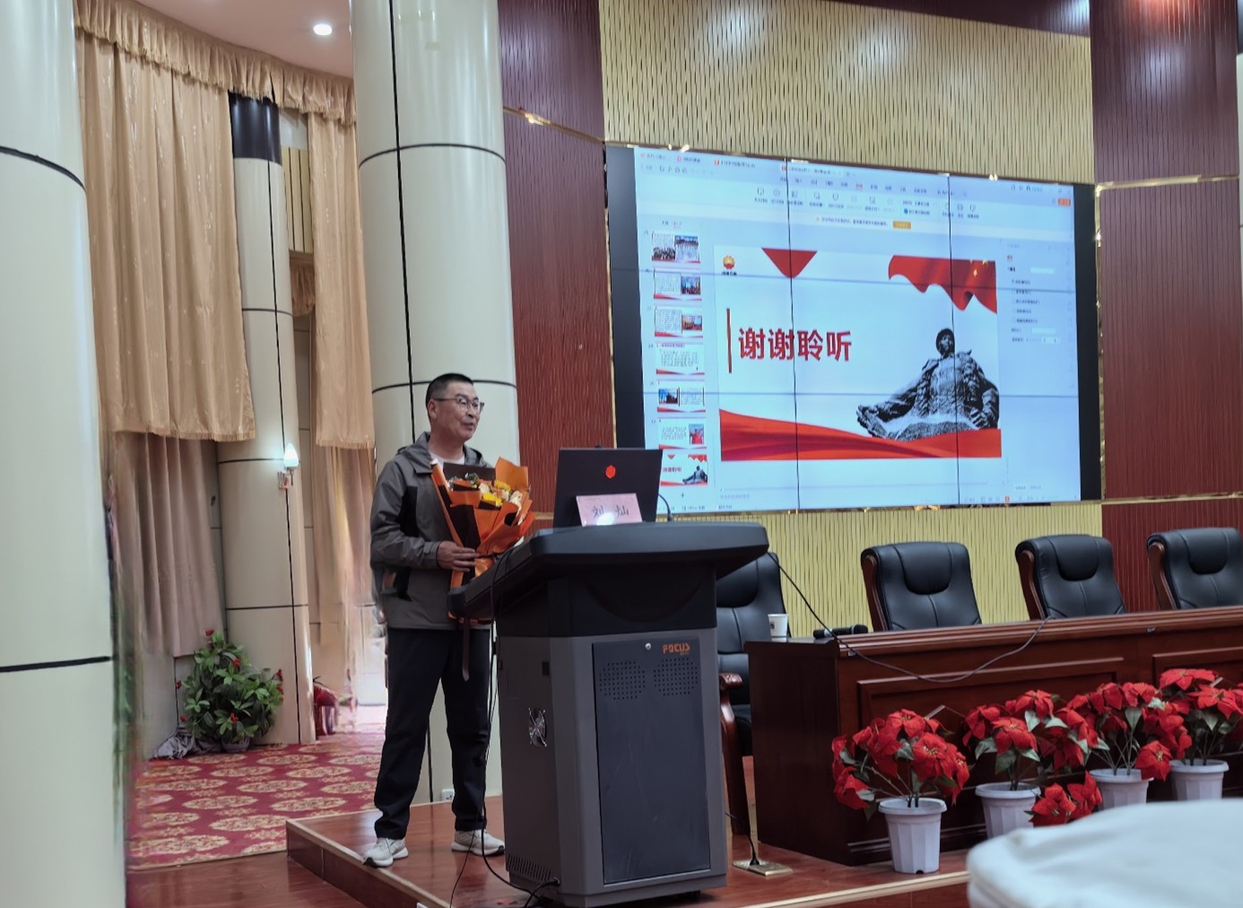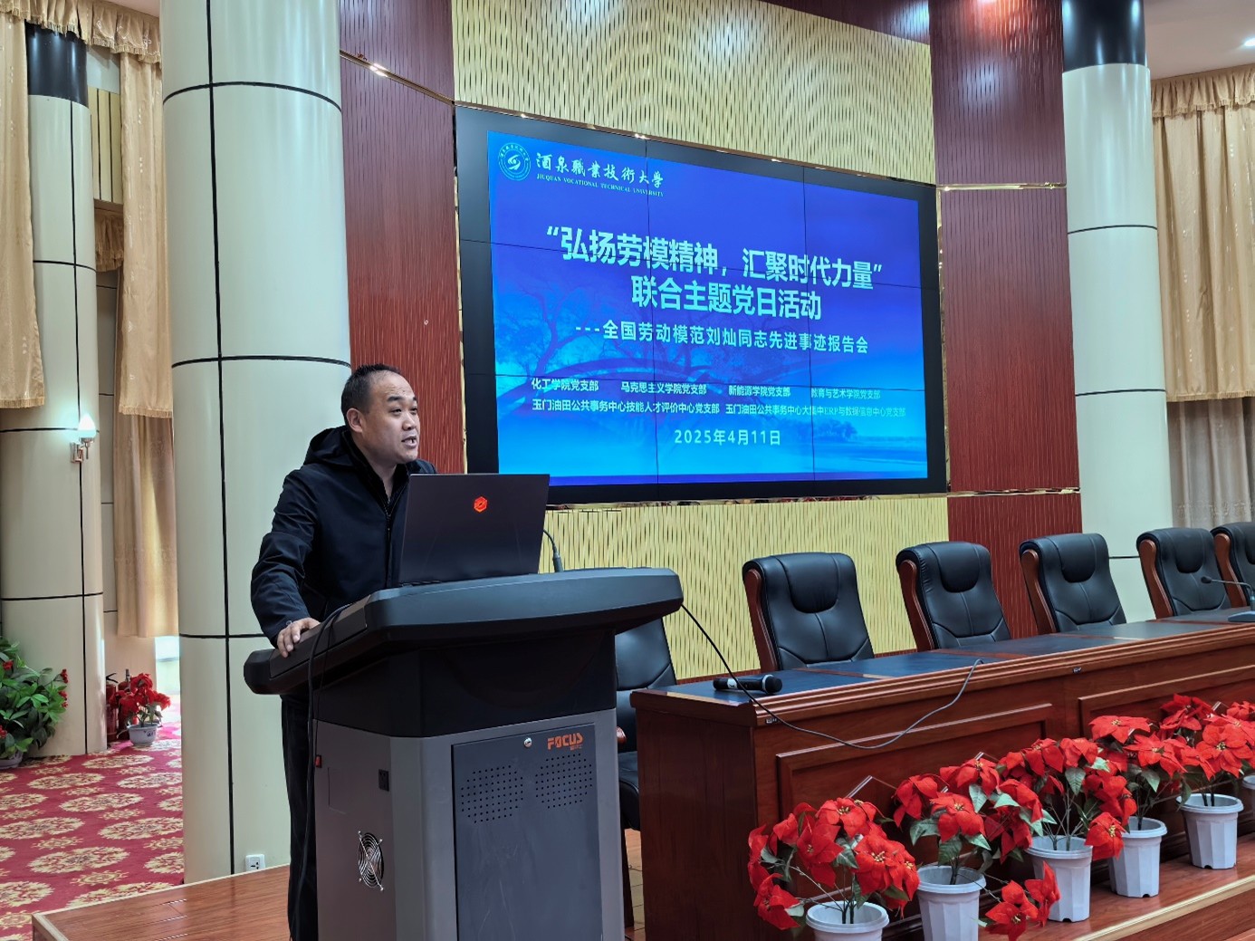 为进一步弘扬铁人精神,锤炼广大师生敢于吃苦、勇于奉献的品格,4月11日下午,化工学院党支部联合玉门油田公共事务中心技能人才评价中心党支部、玉门油田公共事务中心大集中 ERP 与数据信息中心党支部,邀请中国石油玉门油田分公司全国劳动模范刘灿在学校逸夫报告厅举办了一场以 “弘扬劳模精神,汇聚时代力量” 为主题的全国劳动模范事迹报告会。学校化工学院党支部、马克思主义学院党支部、新能源学院党支部、教育与艺术学院党支部的无课教师及学生代表与企业党员近180人共同聆听了报告。