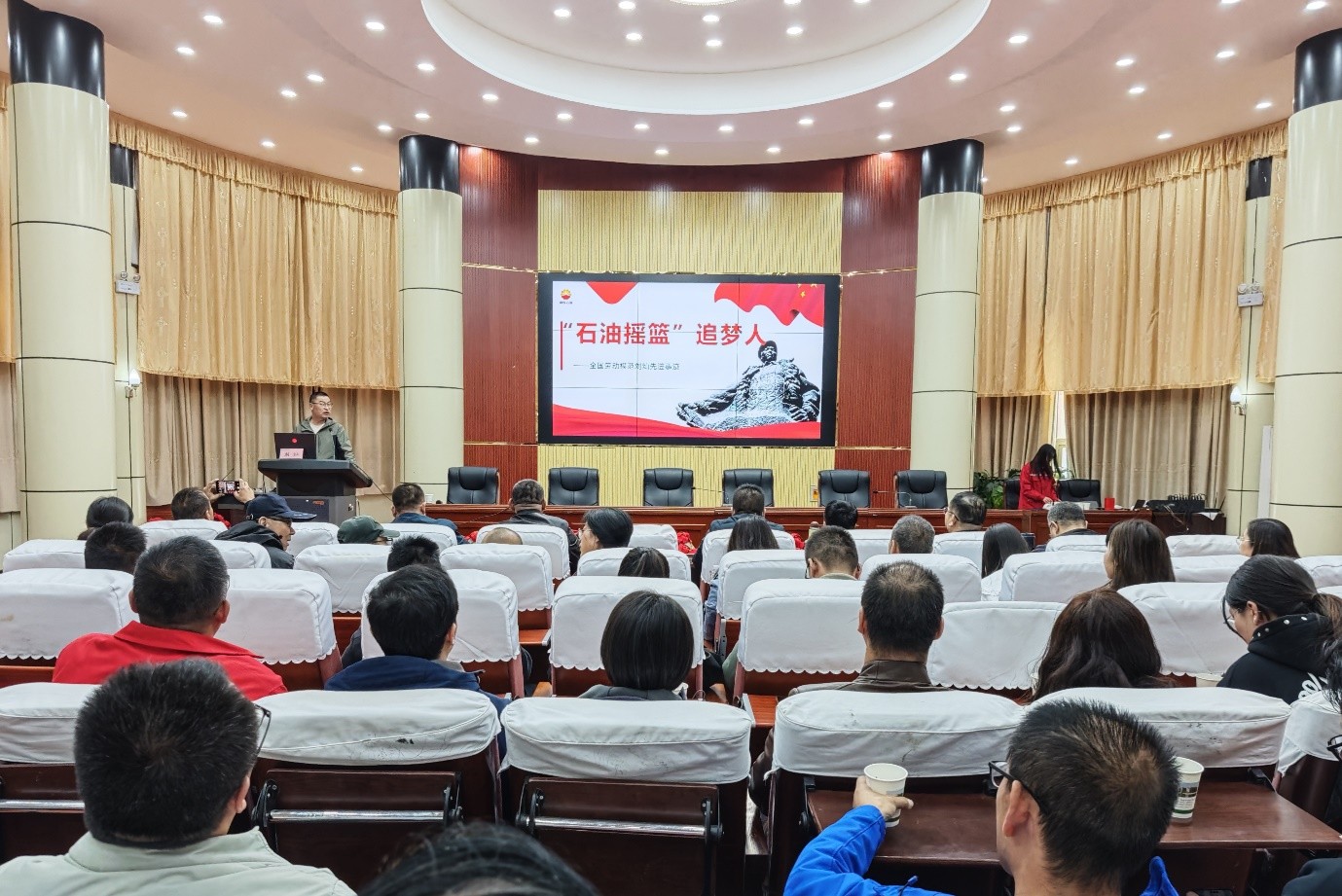 活动现场,全国劳动模范刘灿带来了一场震撼人心的主题报告会 ——“石油摇篮”追梦人。刘灿从“石油娃”寻梦石油报国、钻井“禁区” 化解世界难题、生命“禁区”展现担当奉献、逐梦“双百”油田建功立业四个维度,以真挚的情感、生动的讲述将自己和团队践行铁人精神的的先进事迹娓娓道来。讲述中他列举了他和他的团队与F14H井、C229井、青海省天骏县南祁连盆地木参1井的开采故事,无不体现着他们对铁人精神的生动实践。每一个故事背后,都凝结着他对石油事业的无限热爱与执着坚守,彰显着艰苦奋斗、勇于创新、甘于奉献的劳模精神。