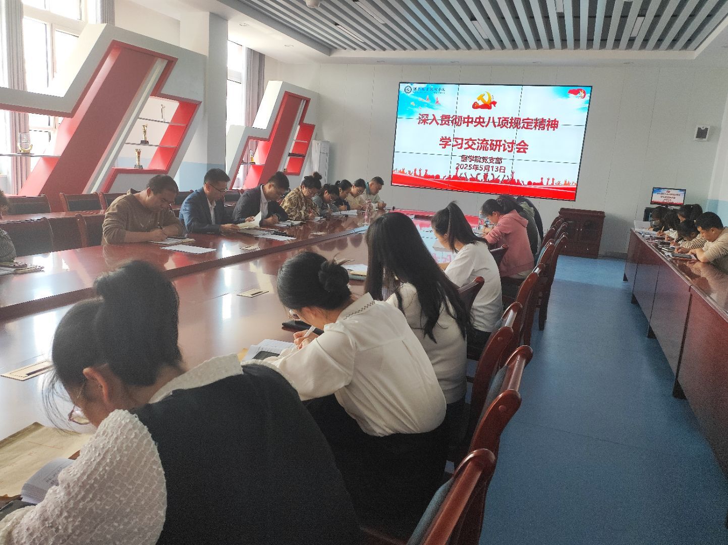 5月13日,医学院党支部开展深入贯彻中央八项规定精神学习教育专题研讨会,医学院党支部书记、院长范玉敏支持会议,医学院全体教职工参加。