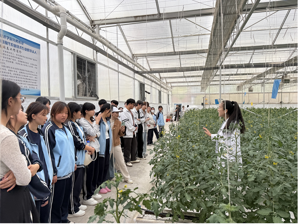 活动中三位教师介绍了农业技术中心的建设发展历史与产业技术应用情况,详细介绍番茄栽培管理技术与无土栽培技术,师生们重点参观了农业技术装备展示区、番茄无土栽培生产区以及水肥一体化蔬菜栽培技术示范区。从品种选择、栽培管理、技术特色等维度进行了系统且深入的讲解。
