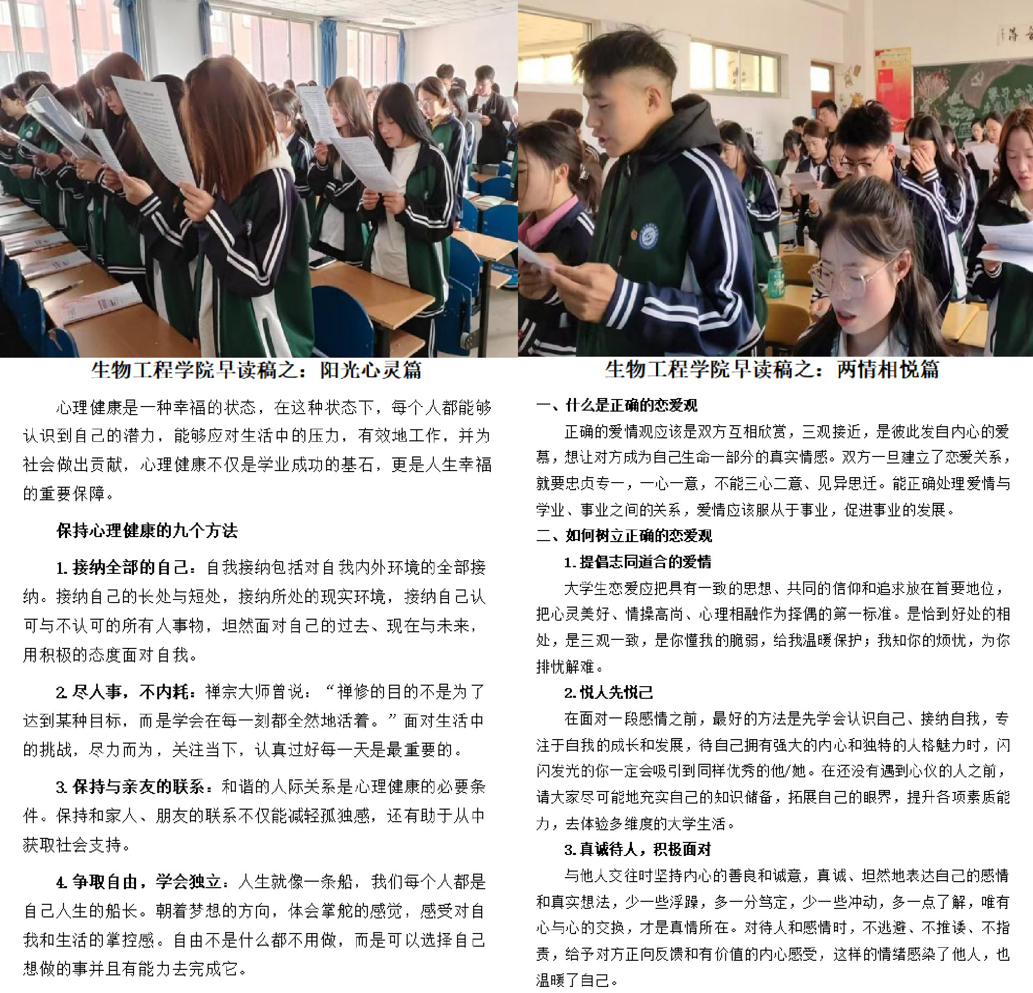 学院利用上课前十分钟,组织学生开展以“阳光心灵”“两情相悦”为内容的早读教育,传授学生保持心理健康的九个方法,引导学生树立正确的恋爱观,提升了学生对心理健康知识的认识和理解。