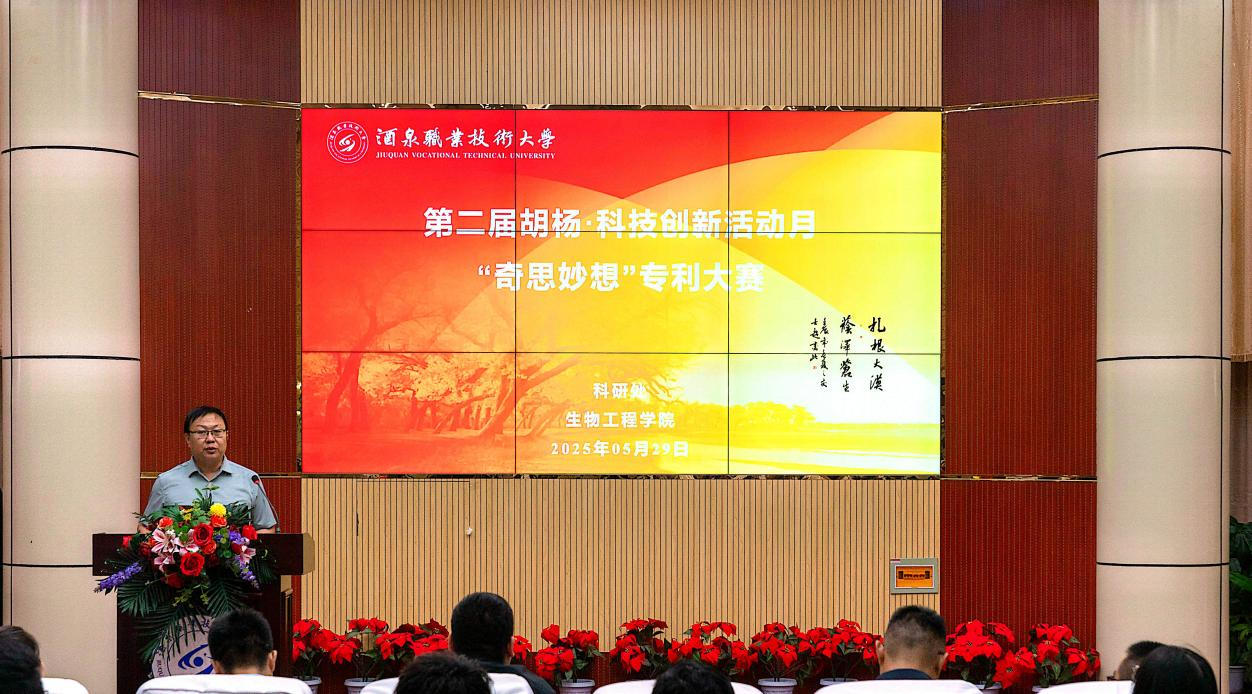 5月29日下午,酒泉职业技术大学第二届“奇思妙想”专利大赛决赛在逸夫楼报告厅隆重举行。学校党委委员、副校长王金明出席活动,科研处、创新创业学院负责人及各学院参赛团队和师生代表参加,生物工程学院党支部书记、院长张涛主持活动。