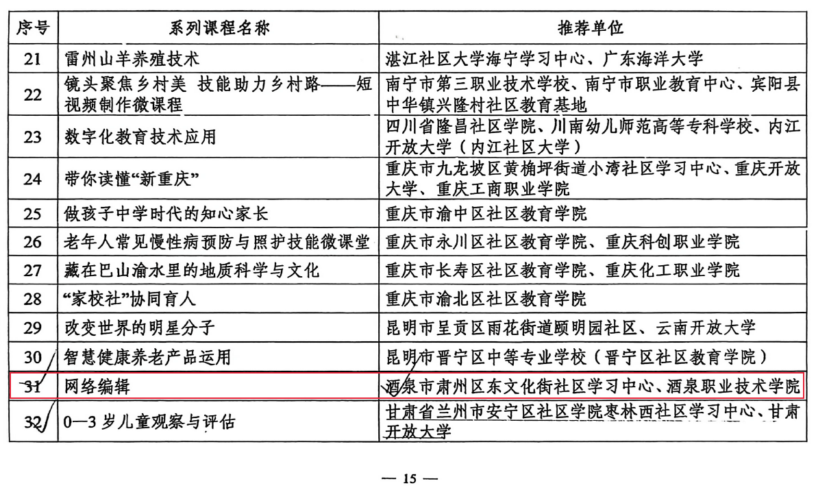 院系动态 > 正文酒泉职业技术大学《网络编辑》等2门课程 入选教育部县域社区学习中心品牌课程