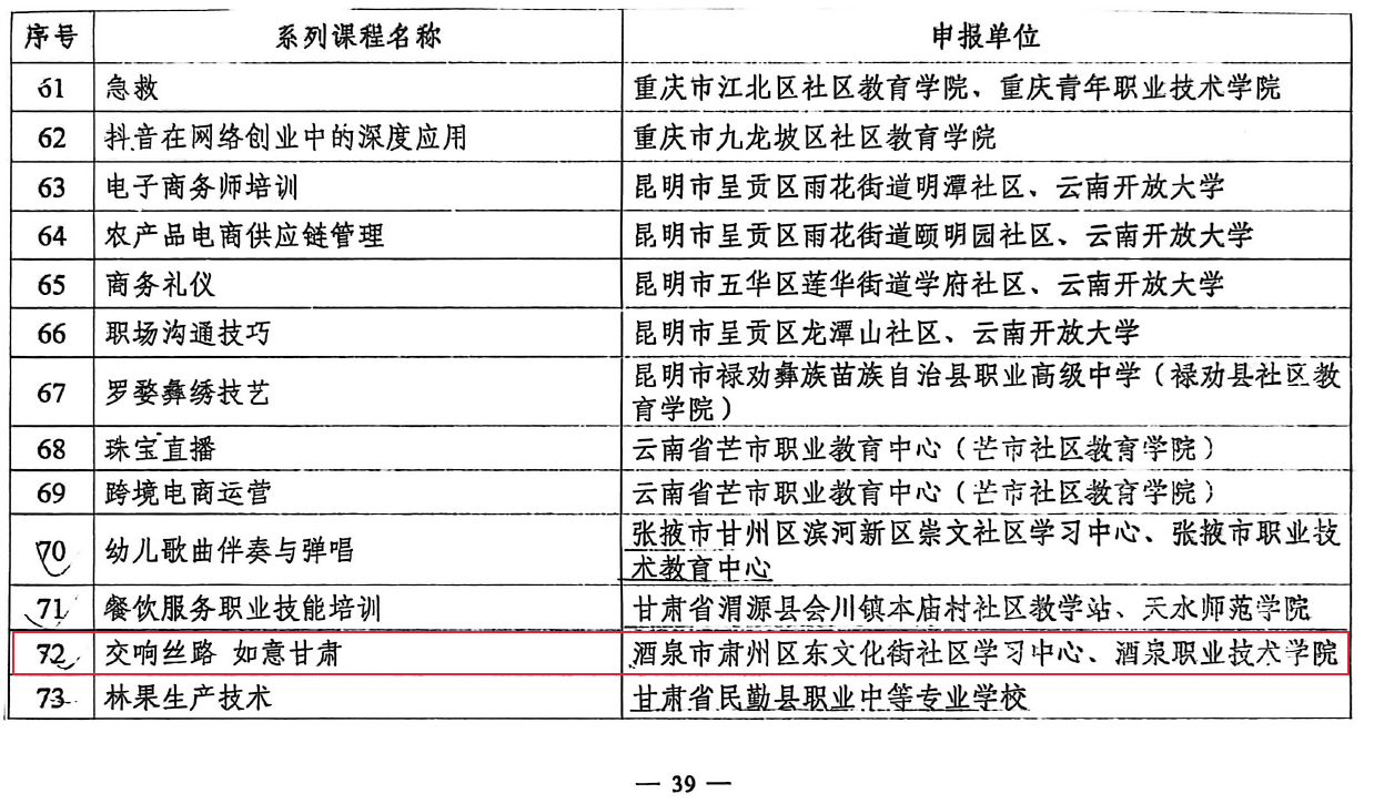 通过各学院推荐、专家团队综合评审及网站公示等环节,酒泉职业技术大学社区教育中心报送的2门课程《网络编辑》《交响丝路 如意甘肃》,经甘肃省教育厅及国家教育部相关部门层层遴选,成功入选2024年县域社区学习中心品牌课程名单。入选课程将通过社区终身学习网站及国家开放大学终身教育平台进行集中展示与共享,为全国县域社区学习中心提供可借鉴的教学模式和课程内容。
