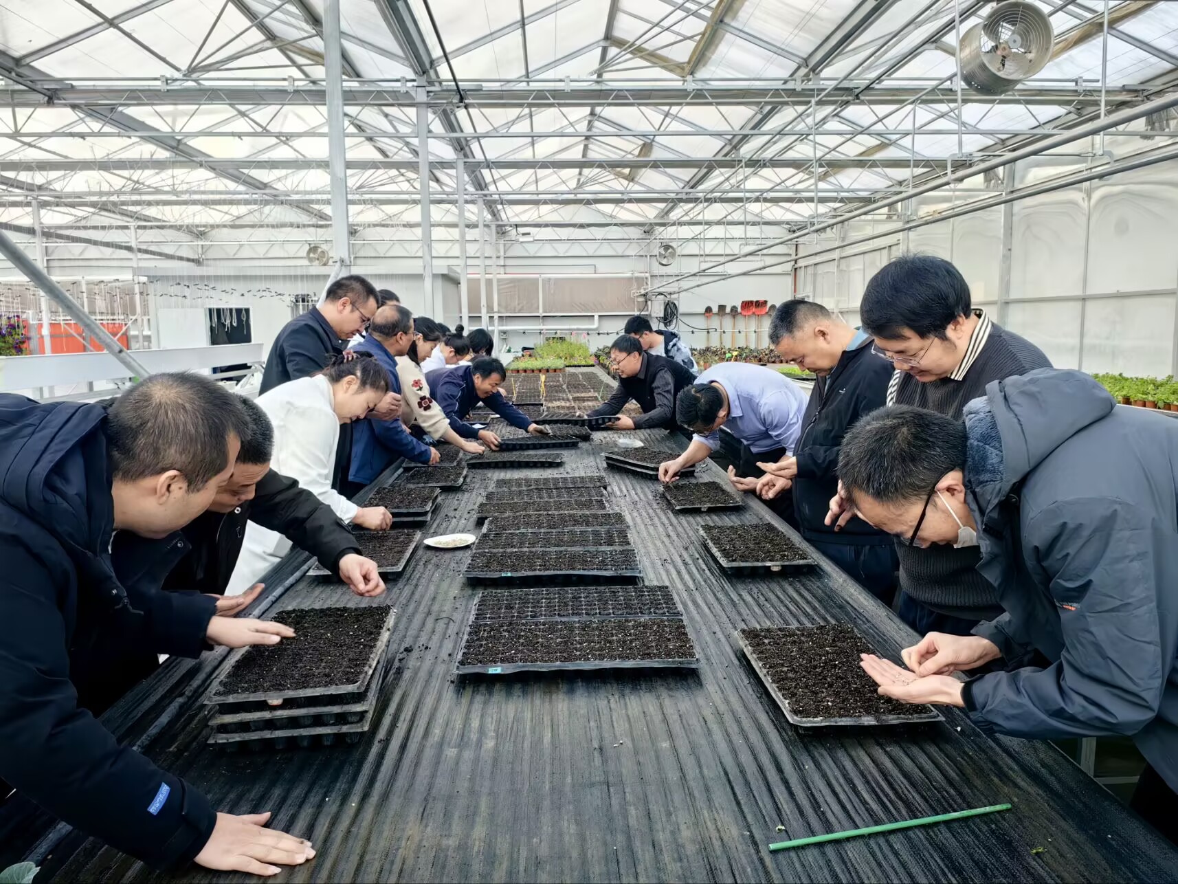 活动现场,全体人员分工明确、配合默契;在基质搅拌区域,老师们严格按照育苗技术规范,精准配比基质成分,通过人工搅拌,确保基质疏松透气、肥力均匀,为幼苗生长筑牢基础;在育苗操作环节,大家小心翼翼地将搅拌好的基质装入育苗盘,细致点播种子、覆盖薄土、浇足定根水,每一个步骤都力求规范到位,充分展现了生物工程学院教师严谨细致的工作态度和扎实过硬的专业技能。